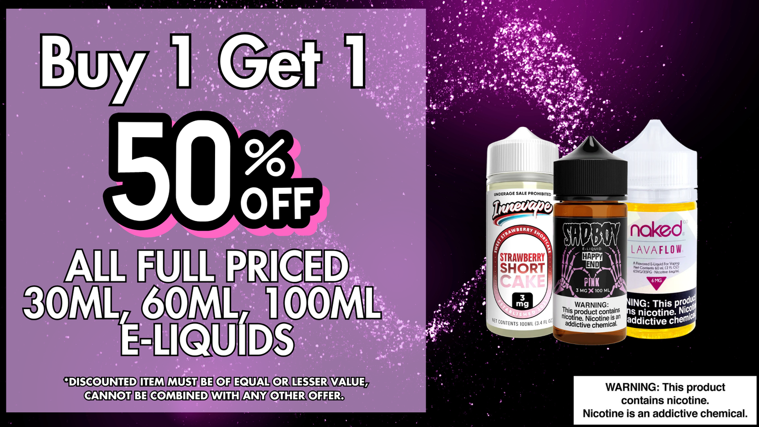 But 1 bottle of E-liquid and save 50% off your choosing of a second bottle! Browse brands like Naked, Twist, Sad Boy, Innevape, Coastal and more!