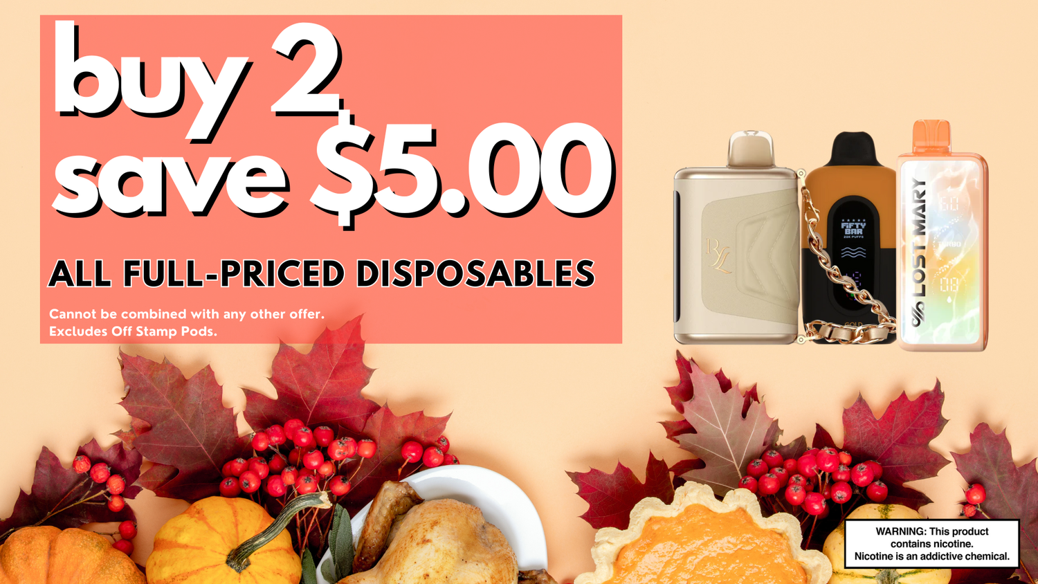 Buy 2 Disposables and Save $5 on all full priced. We are fully stocked and have a variety to choose from than the brands shown. Our selection of disposables includes a wide range of options beyond what is typically available, providing you with more choices to find the perfect fit for your needs.